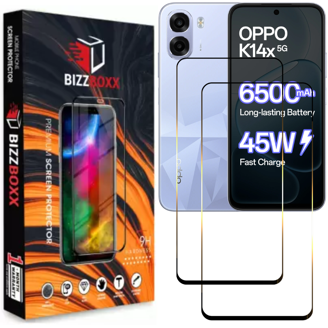 BizzBoxx Premium 11D Tempered Glass for OPPO K14x 5G provides 9H hardness for superior scratch and impact protection. The ultra-slim 0.18mm design ensures HD clarity and smooth touch sensitivity. Features anti-fingerprint, oleophobic and anti-glare coating, 2.5D curved edges, and bubble-free installation for complete screen protection. Includes installation kit for easy application.